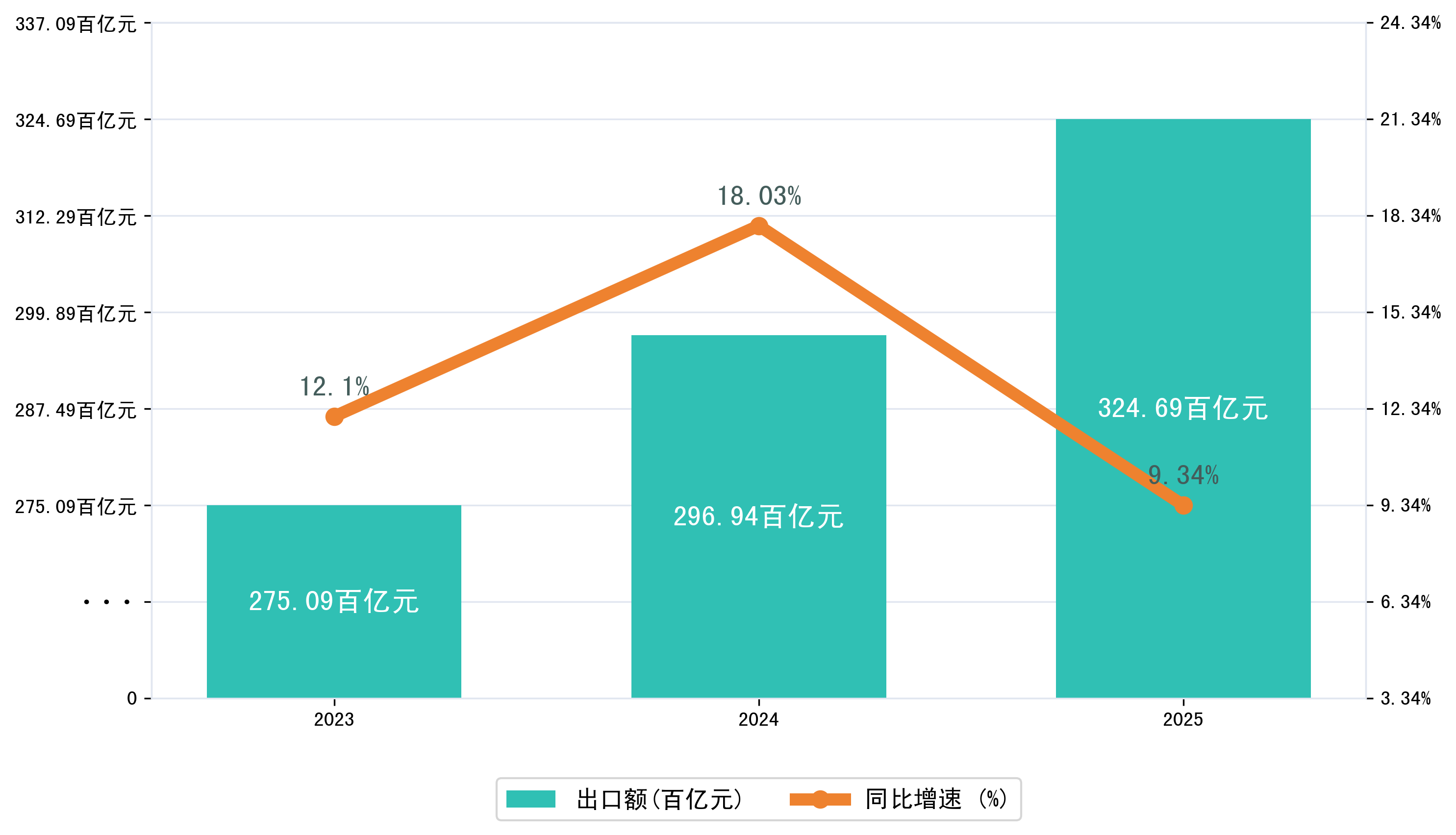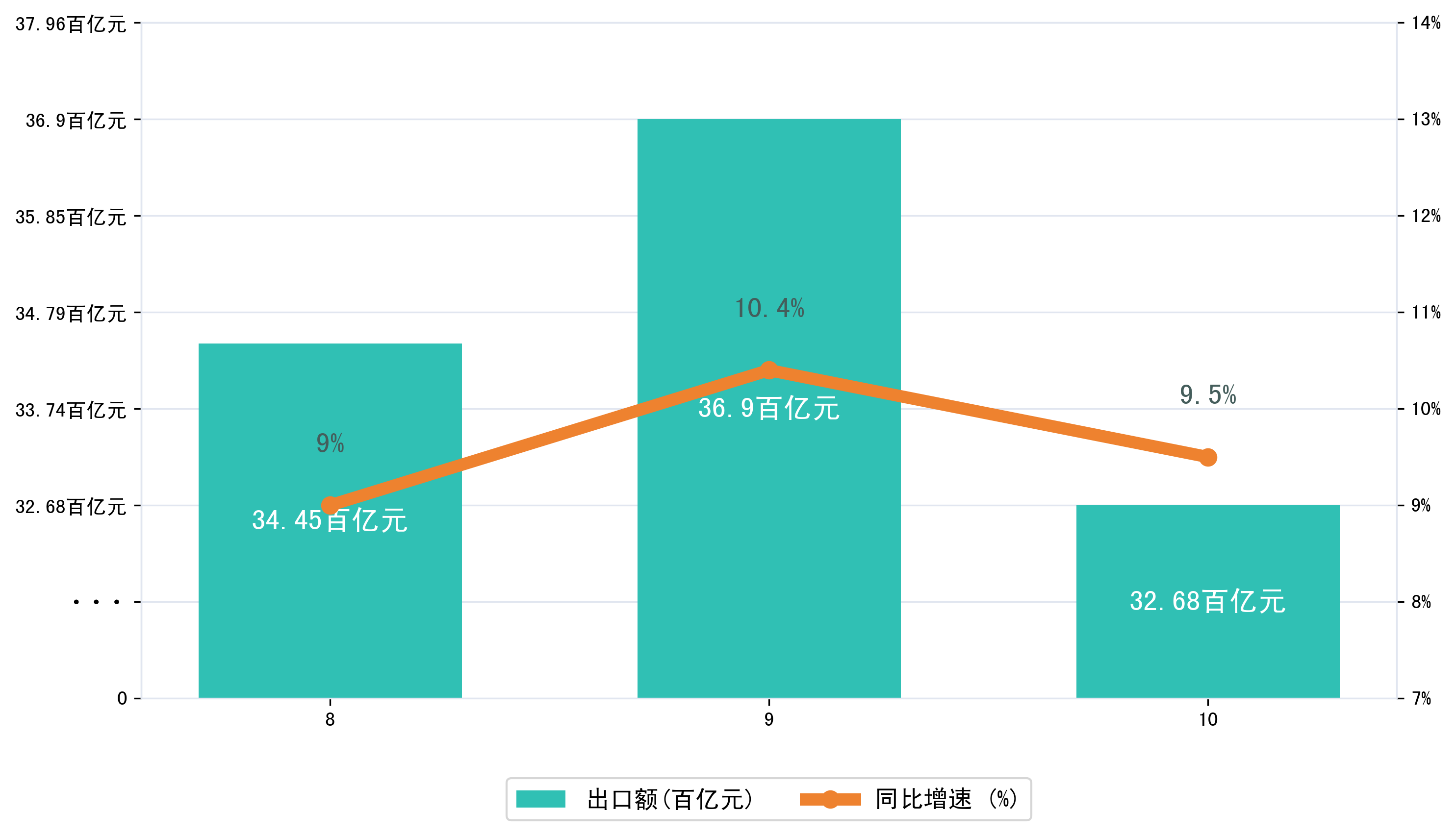 以人民币计,2025年1-10月江苏省出口额为3,2468,8720.0317万元,相比上年同期增加了2774,4762.7382万元,同比增加了9.50%。