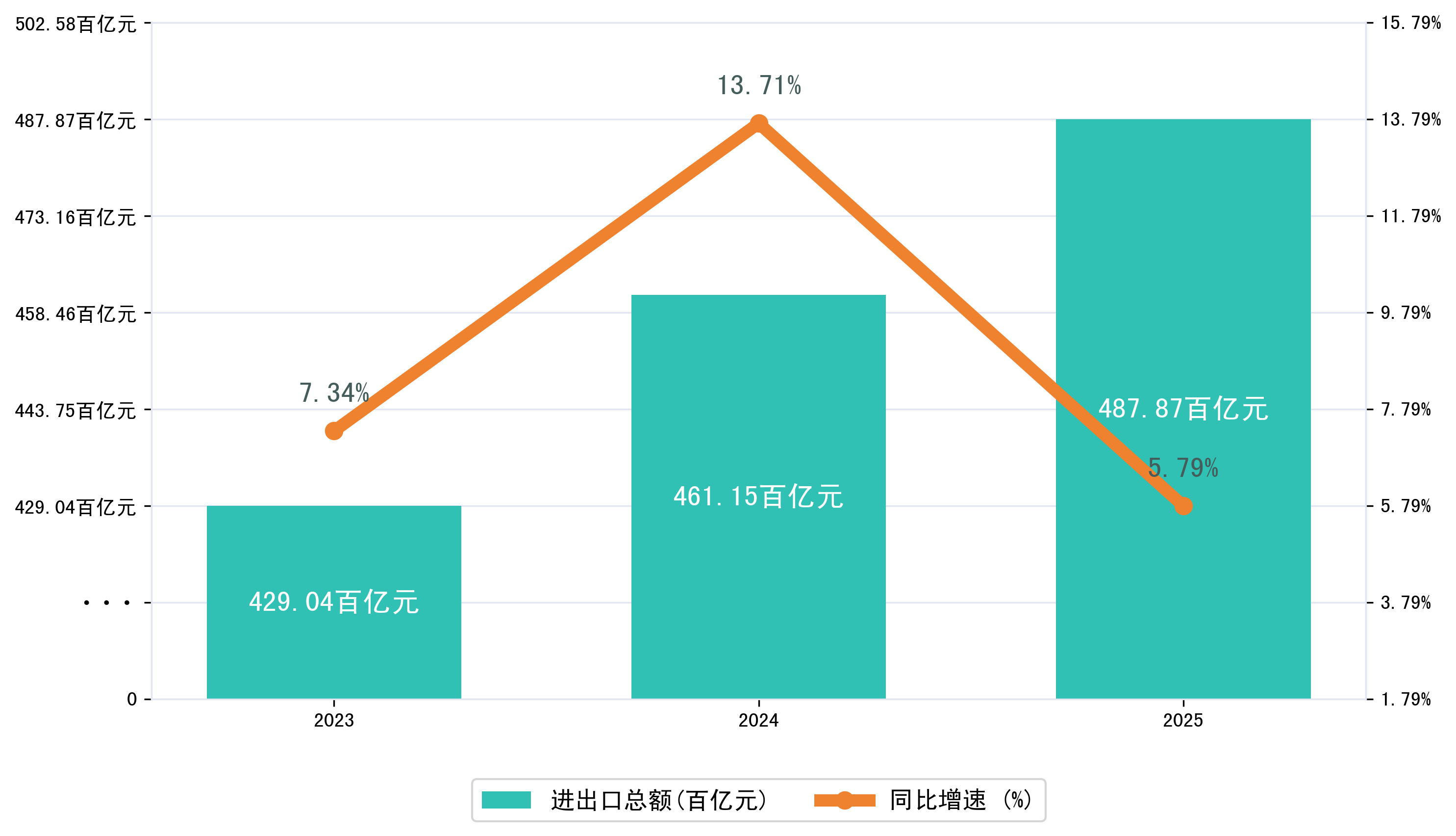 以人民币计,2025年1-10月江苏省进出口总额为4,8787,2254.6601万元,相比上年同期增加了2671,9883.247万元,同比增加了5.90%。