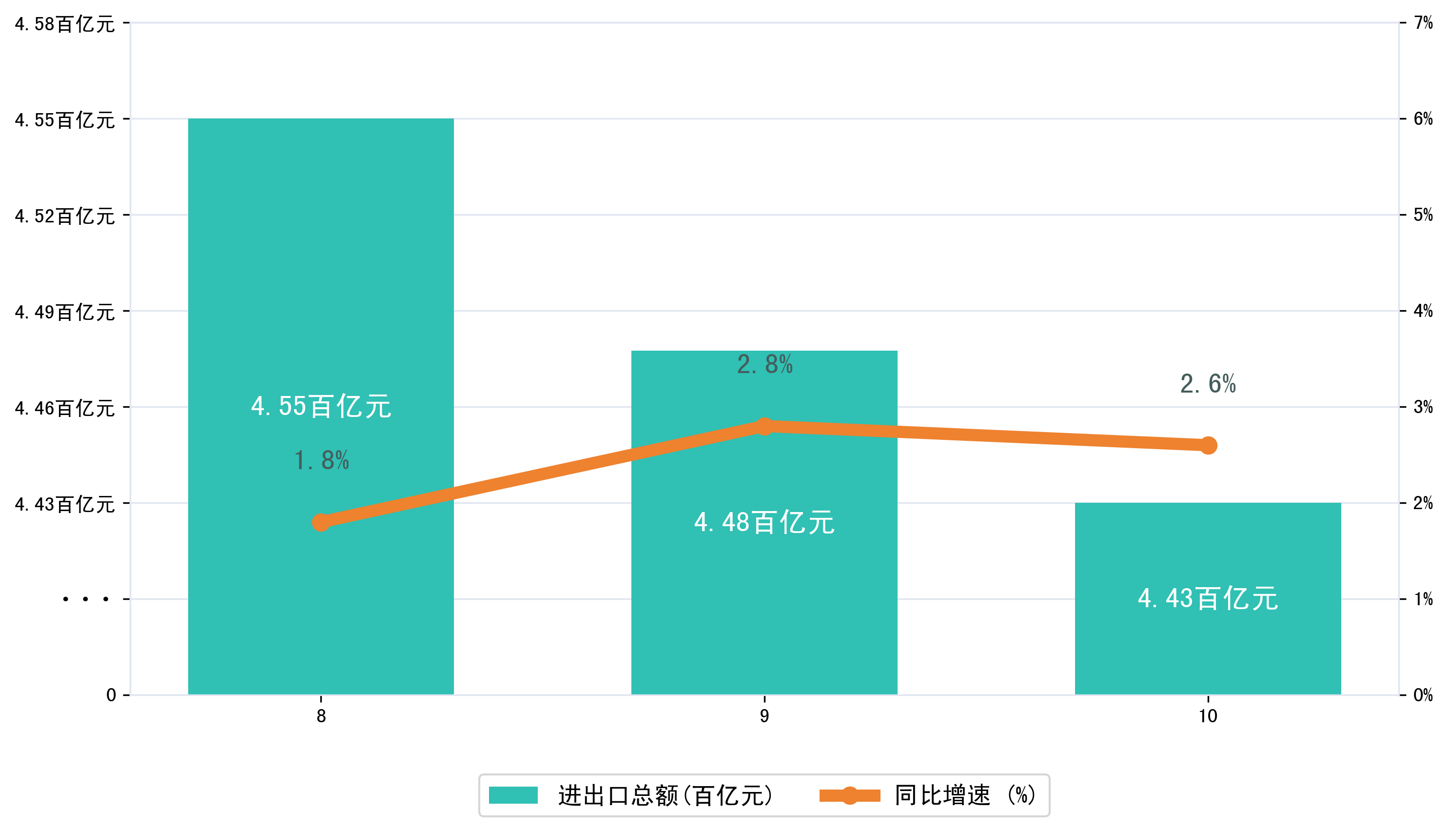 以人民币计,2025年10月江西省进出口总额为443,0028.1164万元,相比上月减少了4,8236.4932万元;相比上年同期增加了4,7786.9121万元,同比增加了2.60%。