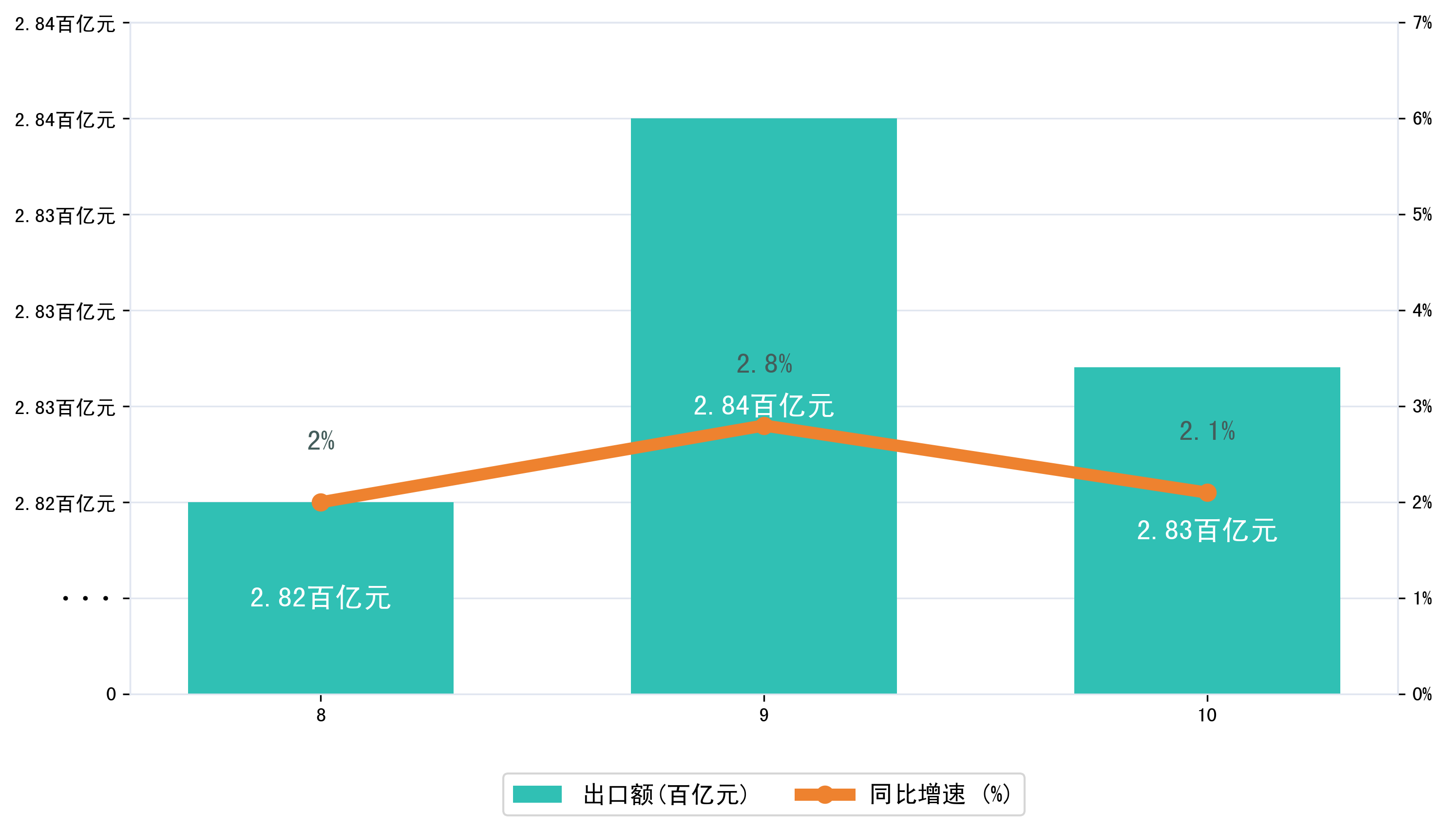 以人民币计,2025年10月江西省出口额为282,9227.0033万元,相比上月减少了8208.5013万元;相比上年同期减少了10,5444.3742万元,同比增加了2.10%。