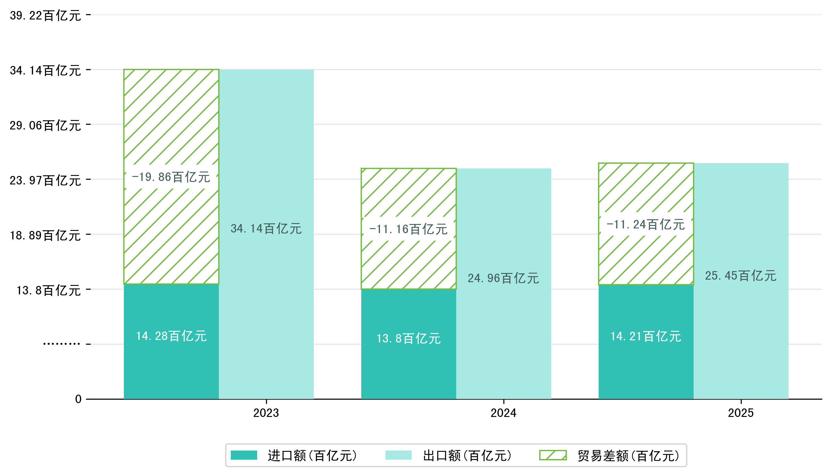 以人民币计,2025年10月江西省贸易差额为122,8425,8902万元(贸易顺差),相比上月增加了3,1819,4906万元,即5034,4303万美元;相比上年同期减少了25,8675,6606万元,同比减少-17.39%。