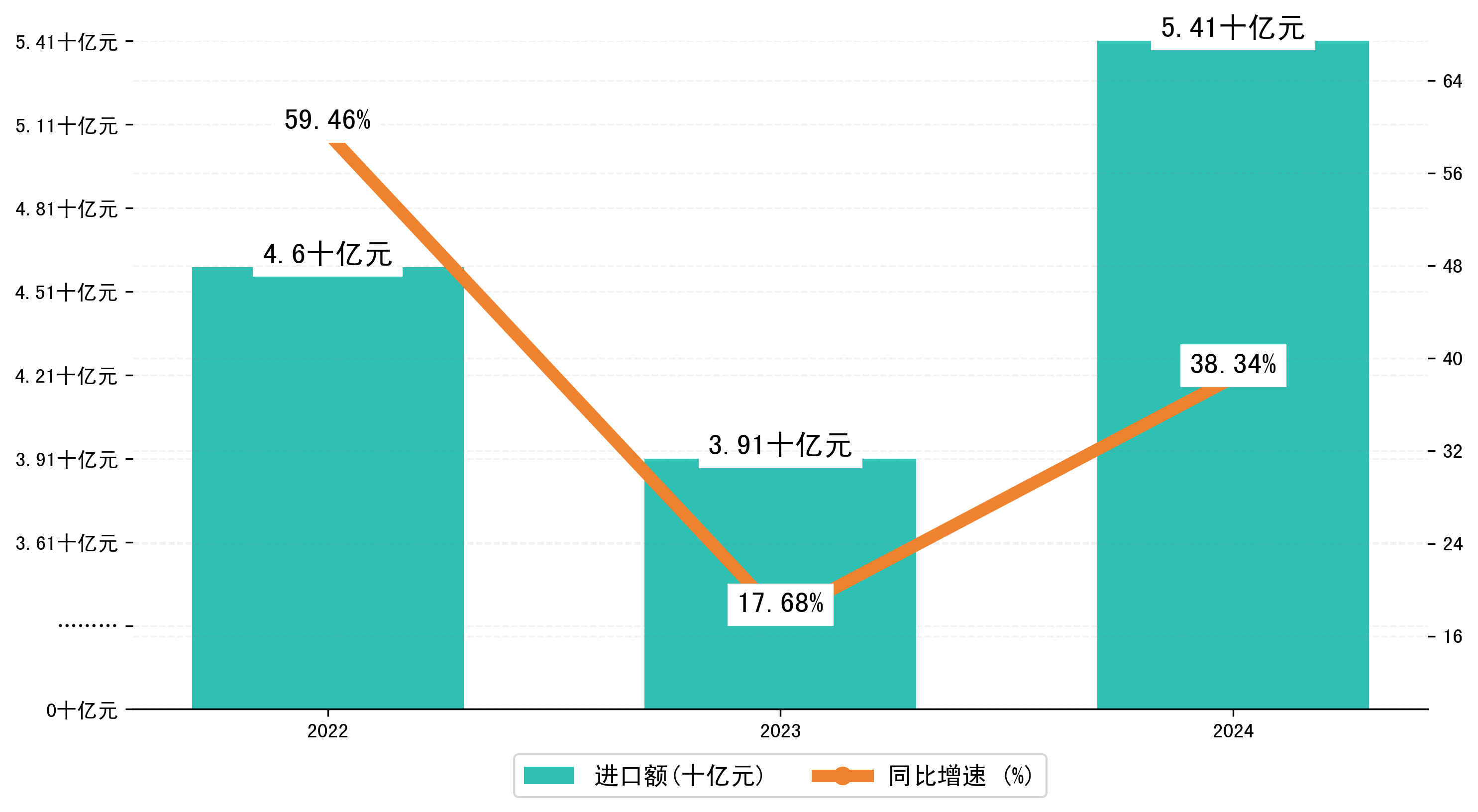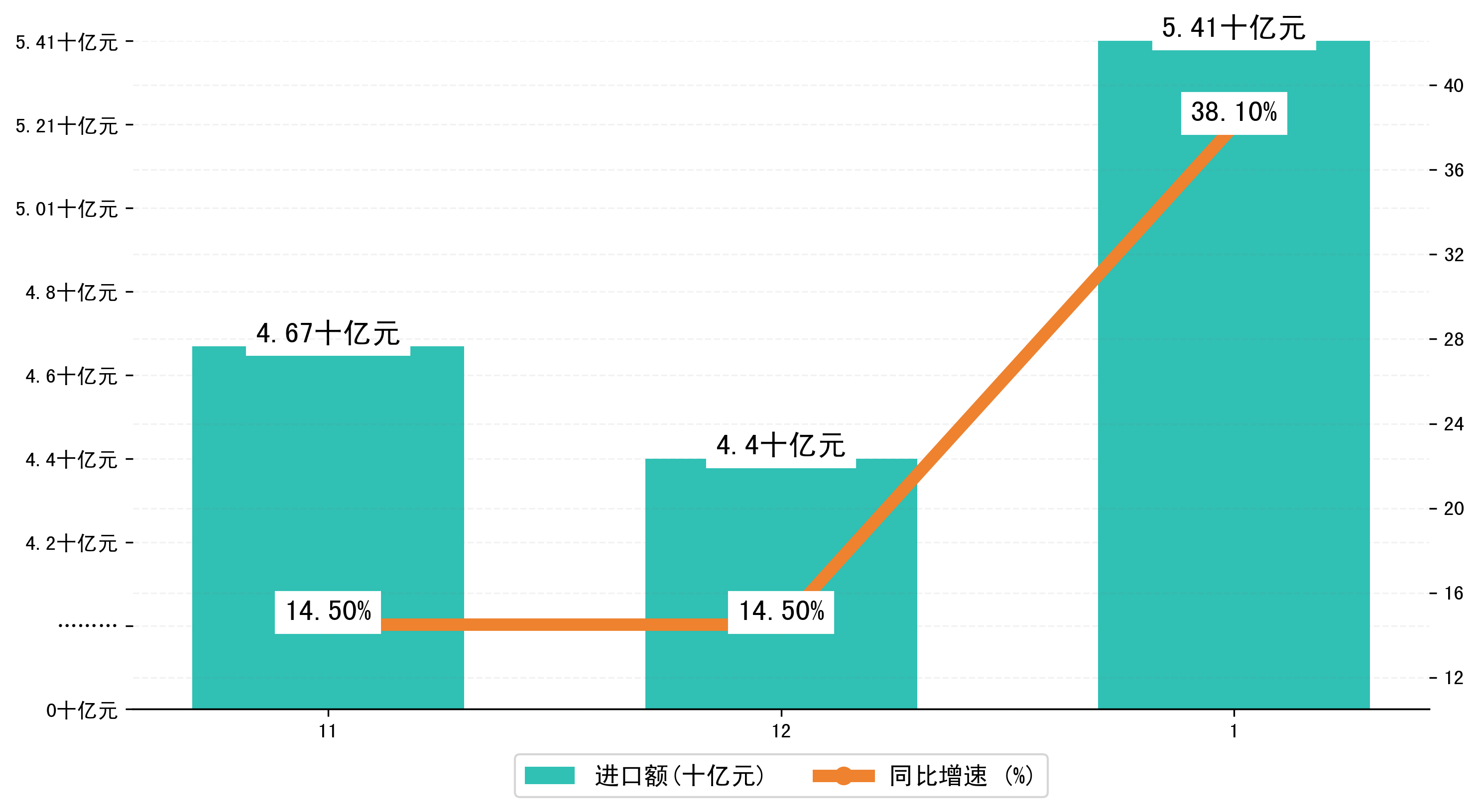 以人民币计,2024年1月海口市进口额为54,1468.1692万元,相比上月增加了10,1623.8895万元;相比上年同期增加了15,0065.3701万元,同比增加了38.10%。