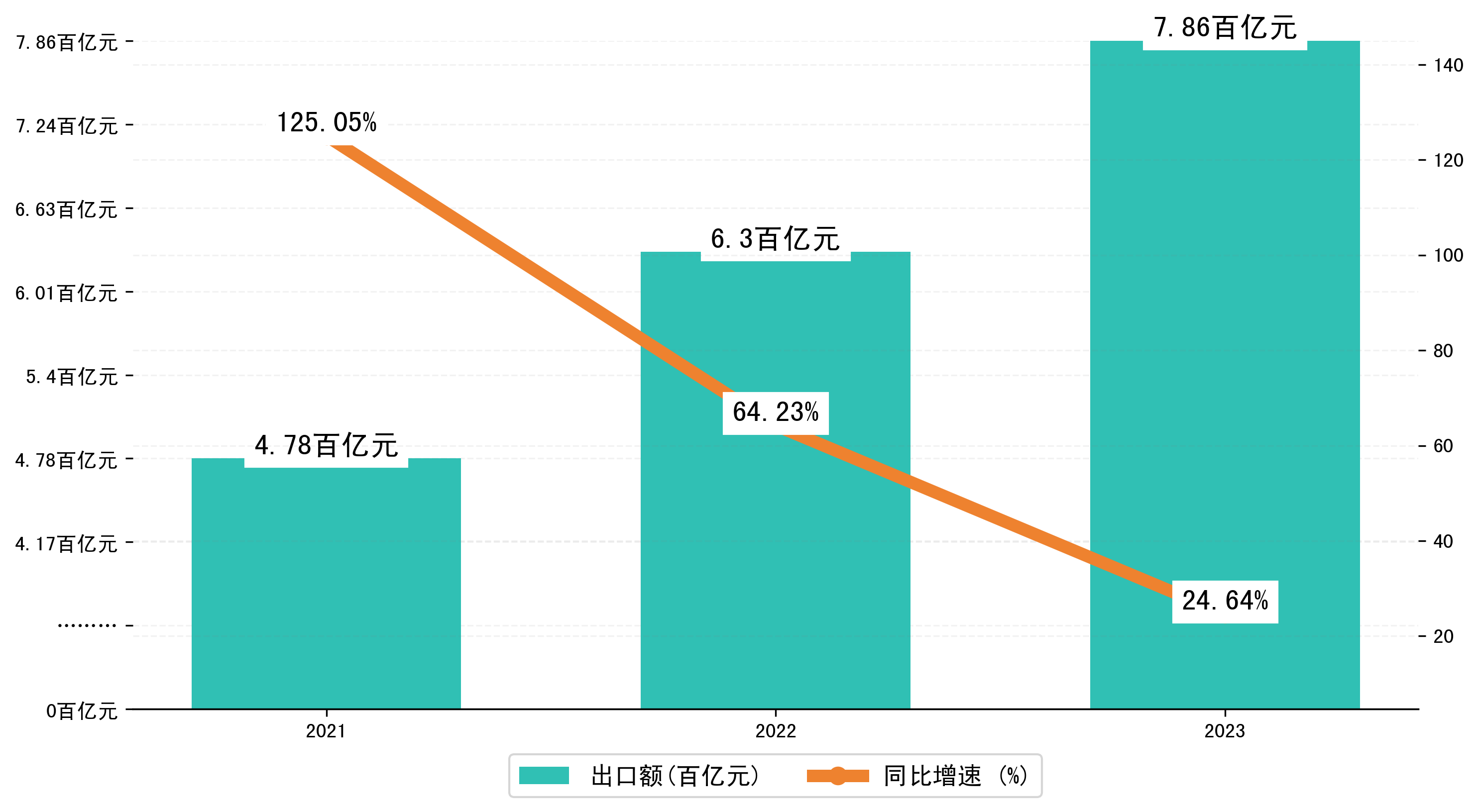 以人民币计,2023年1-12月内蒙古自治区出口额为785,6854.0954万元,相比上年同期增加了155,3400.2754万元,同比增加了28.10%。