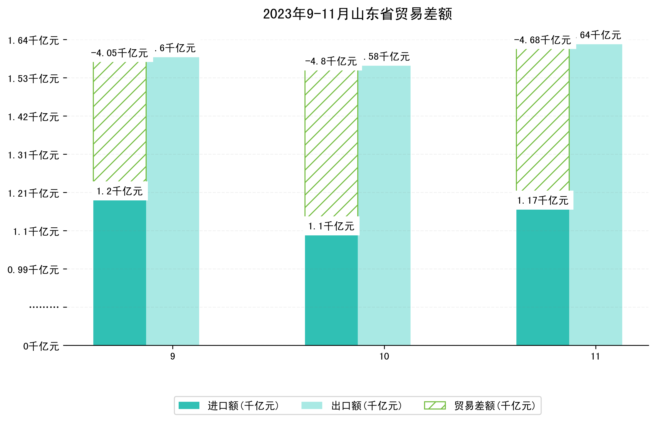 以人民币计,2023年1-11月山东省贸易差额为5428,9495,4047万元(贸易顺差),相比上年同期减少了934,0055,6349万元,同比减少-14.68%。