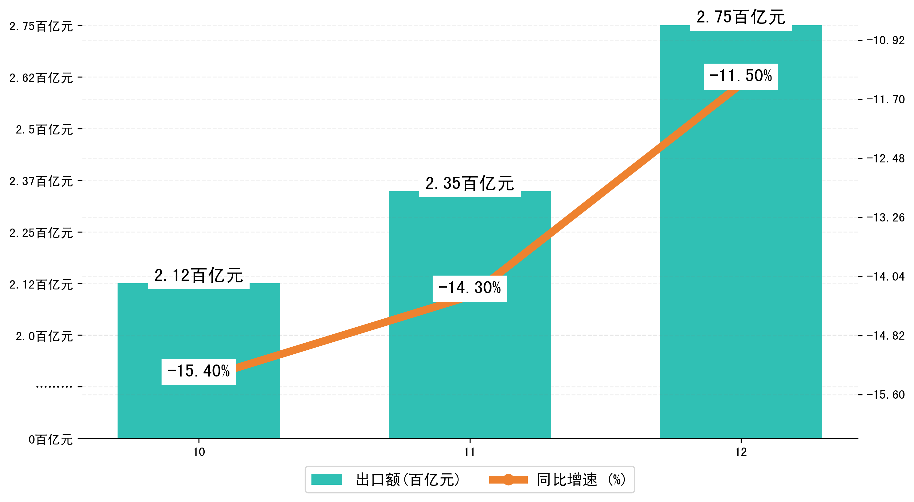 以人民币计,2023年12月陕西省出口额为274,8461.0197万元,相比上月增加了40,2541.8468万元;相比上年同期增加了32,4832.4891万元,同比减少了-11.50%。