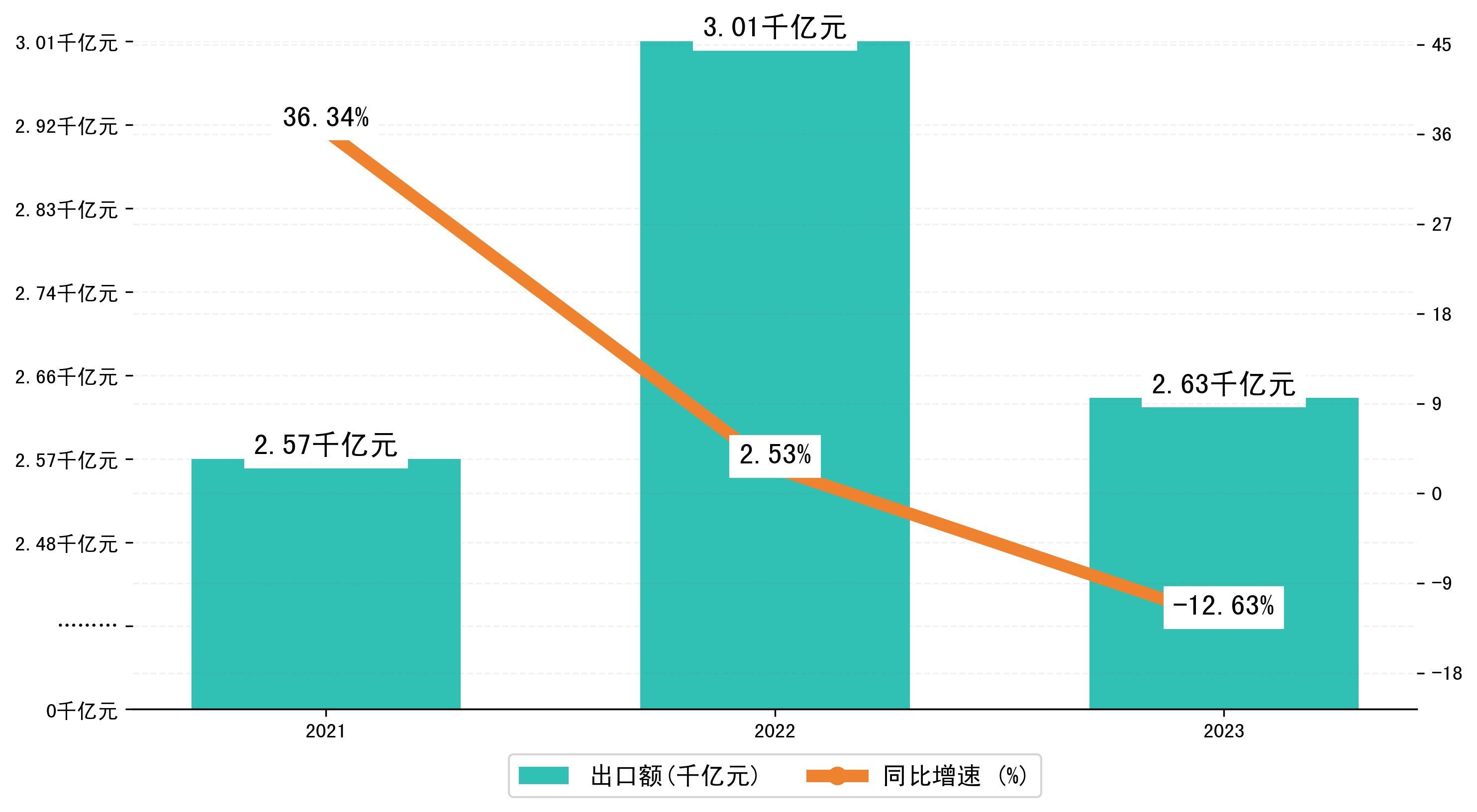 以人民币计,2023年1-12月陕西省出口额为2630,9201.2335万元,相比上年同期减少了380,4293.8475万元,同比减少了-11.50%。