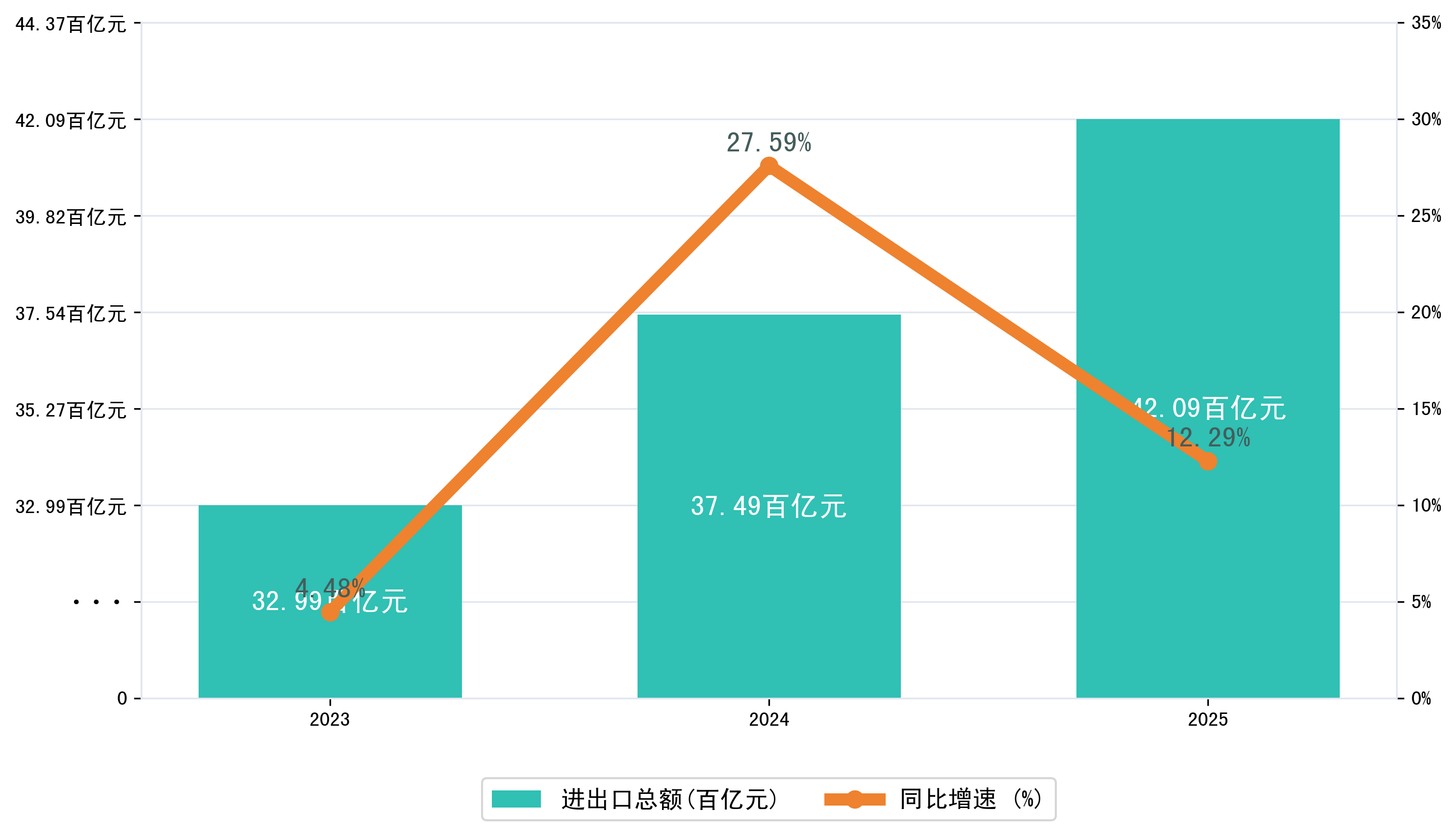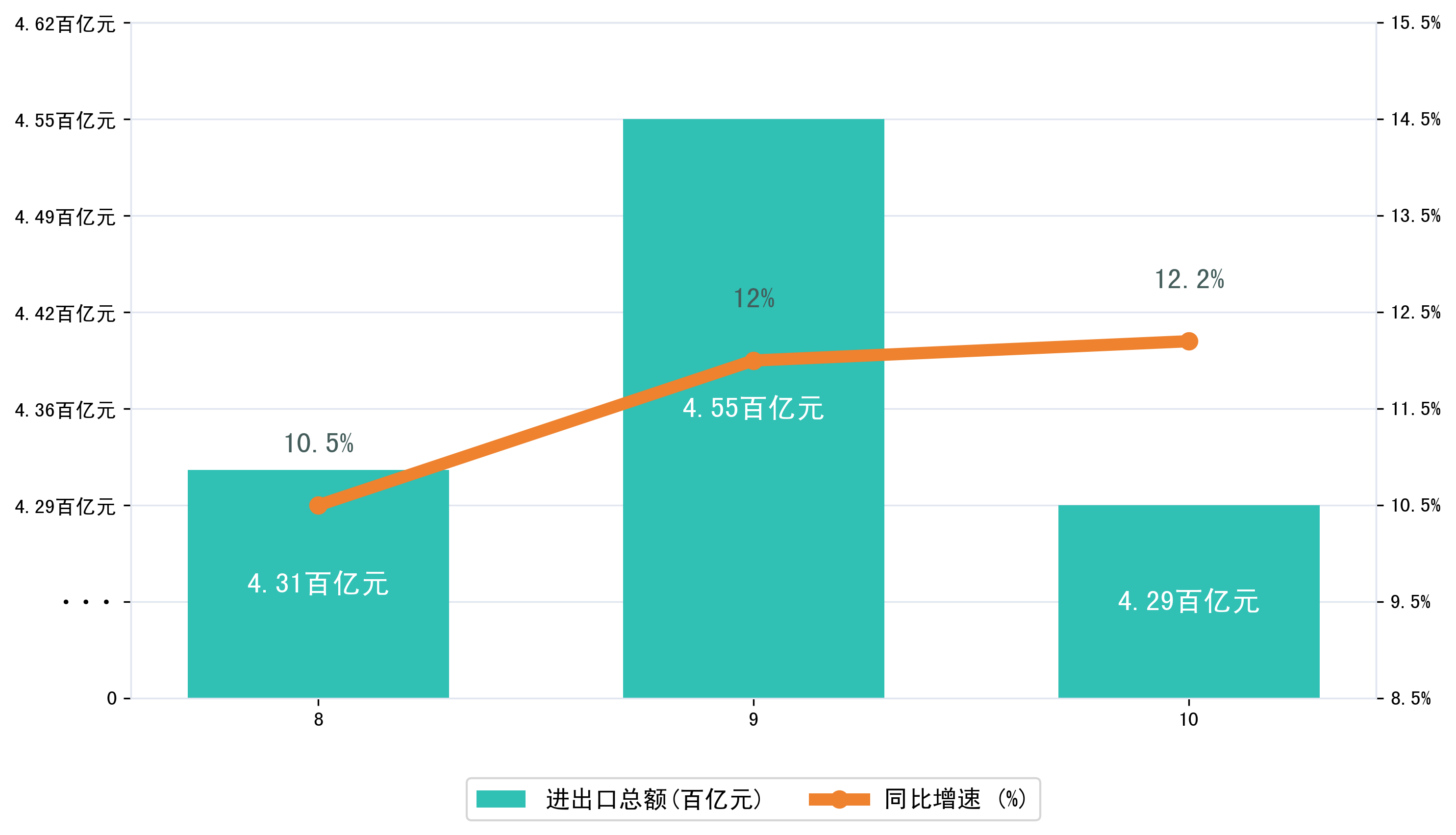 以人民币计,2025年1-10月陕西省进出口总额为4209,4989.6099万元,相比上年同期增加了460,6995.6981万元,同比增加了12.20%。