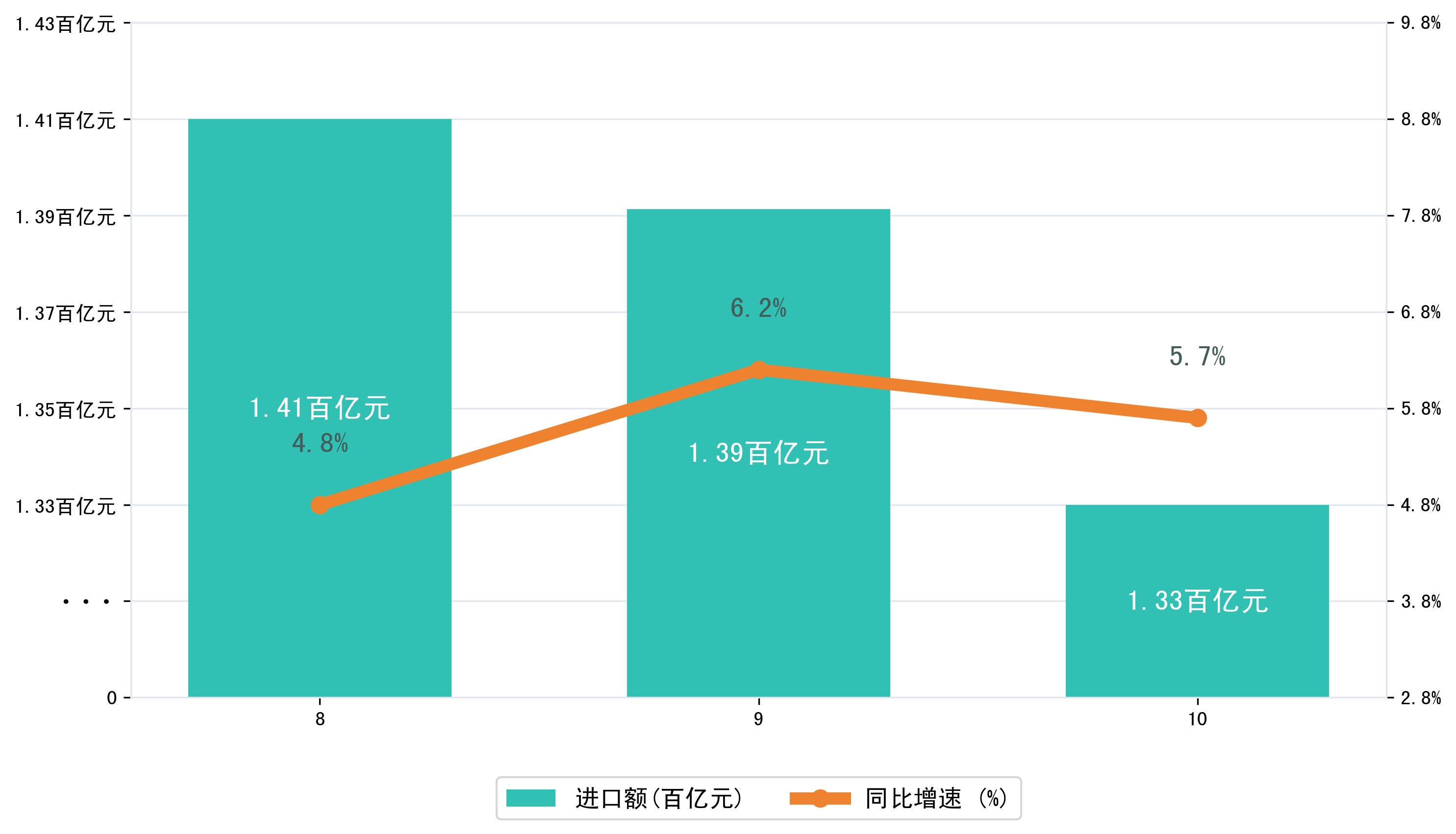 以人民币计,2025年10月陕西省进口额为133,2399.5773万元,相比上月减少了5,8070.6519万元;相比上年同期增加了1,8941.6523万元,同比增加了5.70%。