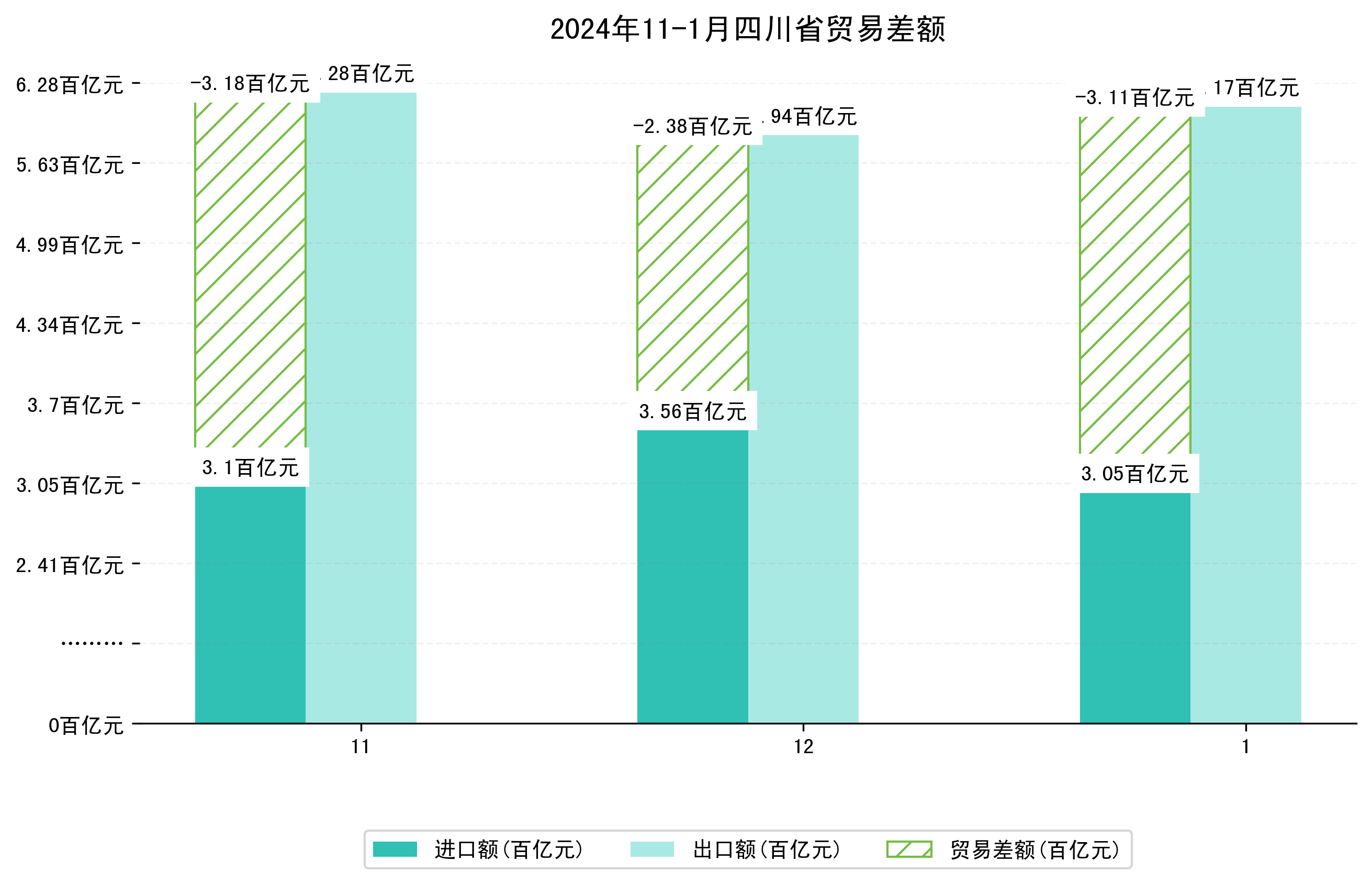 以人民币计,2024年1月四川省贸易差额为311,4260,2951万元(贸易顺差),相比上月增加了73,5135,1739万元,即10,6766,2617万美元;相比上年同期减少了39,1766,1801万元,同比减少-11.17%。