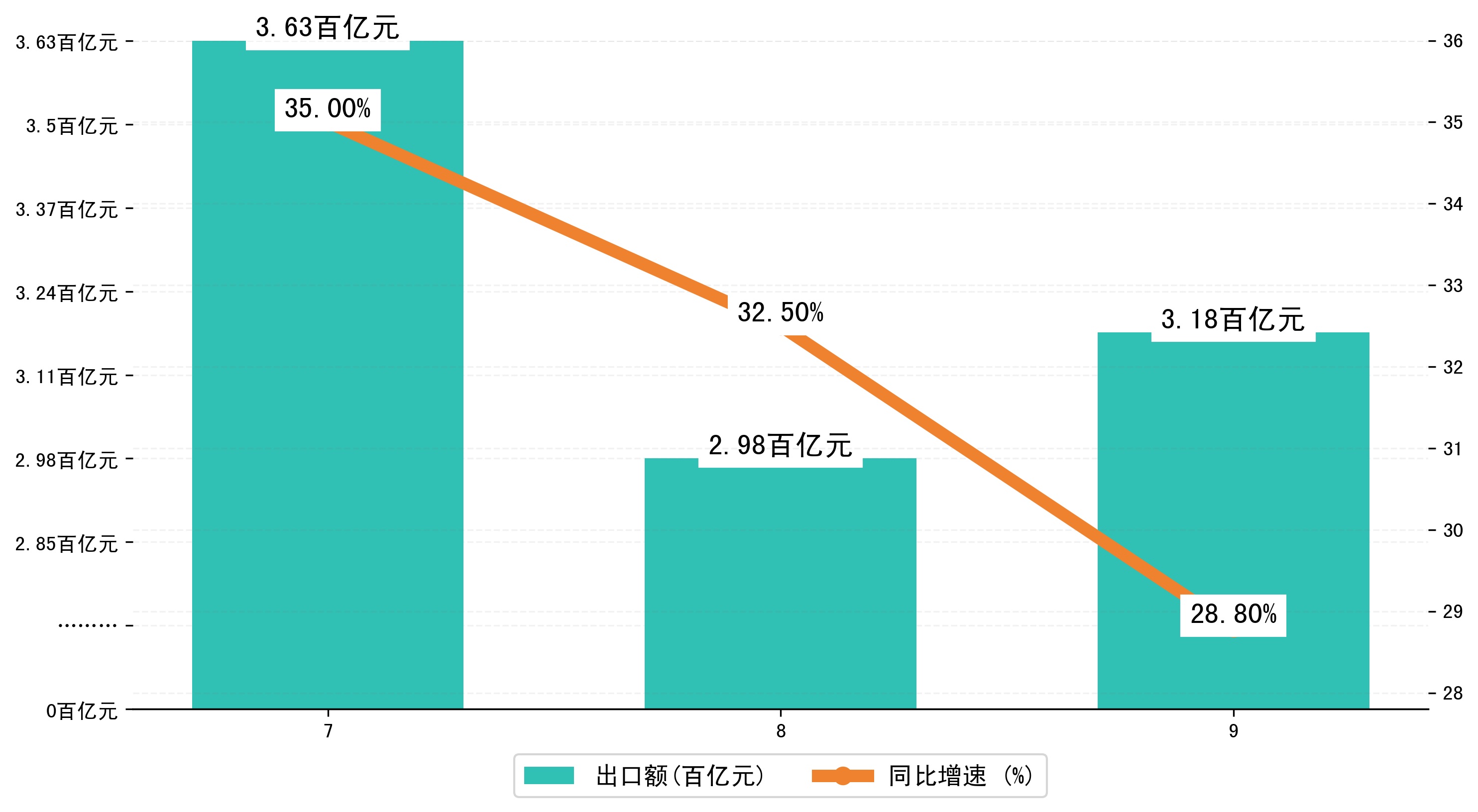 以人民币计,2025年1-9月新疆维吾尔自治区出口额为3504,6532.9676万元,相比上年同期增加了776,8752.1572万元,同比增加了28.80%。