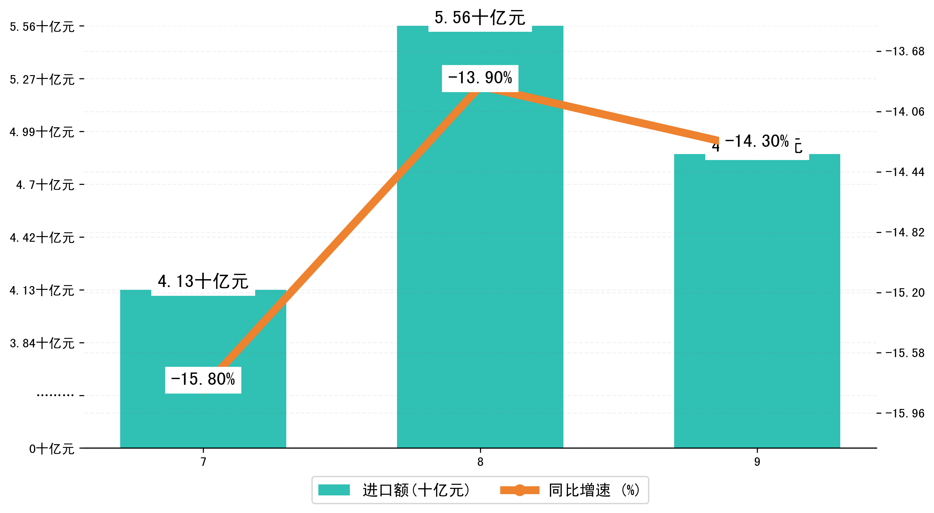 以人民币计,2025年9月新疆维吾尔自治区进口额为48,6492.9538万元,相比上月减少了6,9547.0658万元;相比上年同期减少了11,8222.1181万元,同比减少了-14.30%。